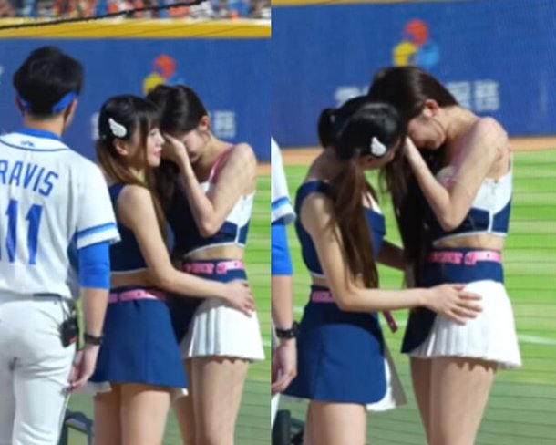 머리카락과 손으로 얼굴을 가리고 눈물을 닦는 모습에 현장 팬들은 당황했고, "울지 마세요"라며 위로의 응원까지 보내는 상황이 벌어졌습니다. 함께 응원하던 대만 치어리더들 역시 그녀에게 다가가 따뜻하게 위로를 건넸습니다.